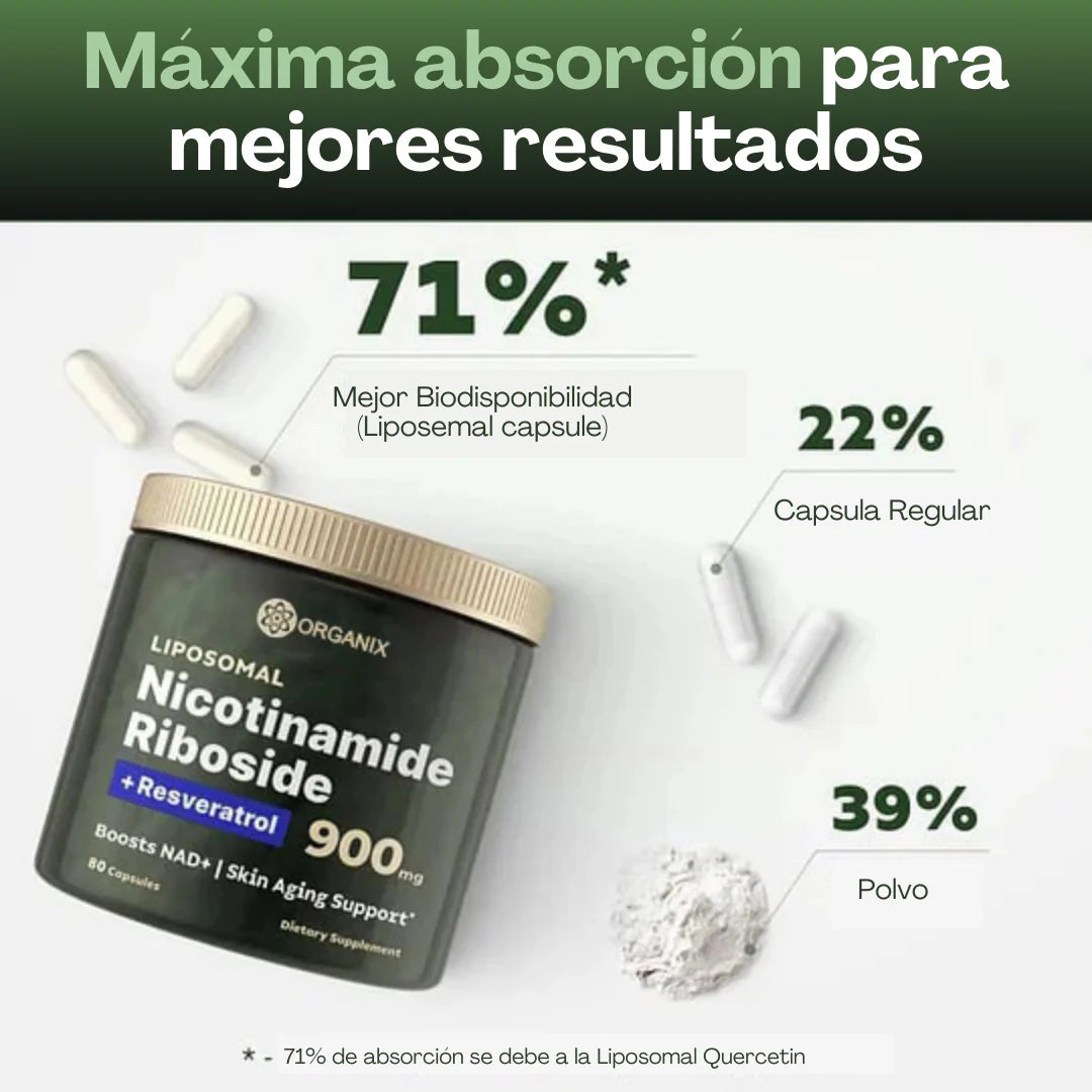 🌿Ingredientes probados:potenciado por ribósido de nicotinamida liposomal, resveratrol y quercetina para una mejor absorción y biodisponibilidad, aumentando la producción y utilización de NAD+ hasta en un 71%.